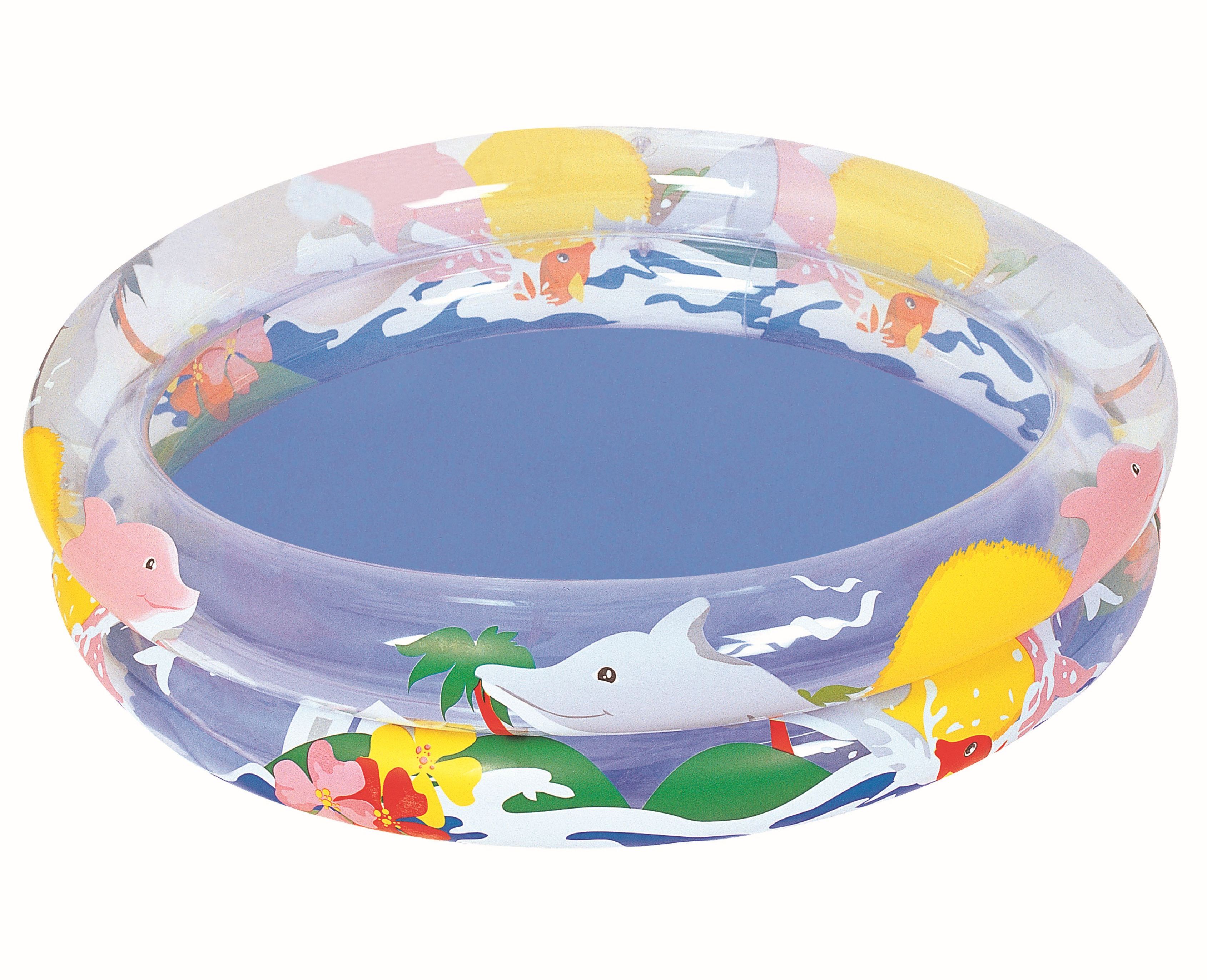 Průhledné stěny bazénku tvoří dvě vzduchové komory s bezpečnostními ventily. Barevný potisk delfínů.