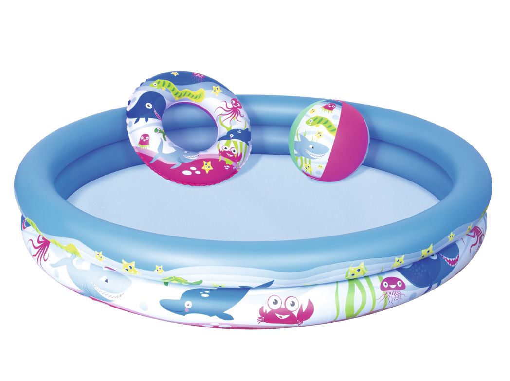 Súprava detského bazéna s nafukovacím kruhom a loptou. Bazén má 2 nafukovacie kruhy.