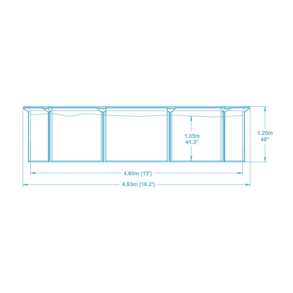 Vonkajšie oceľové steny, vnútorná PVC fólia 0,3 mm s UV filtrom, pevný kovový okraj (16 cm), zabudovaný skimmer.
