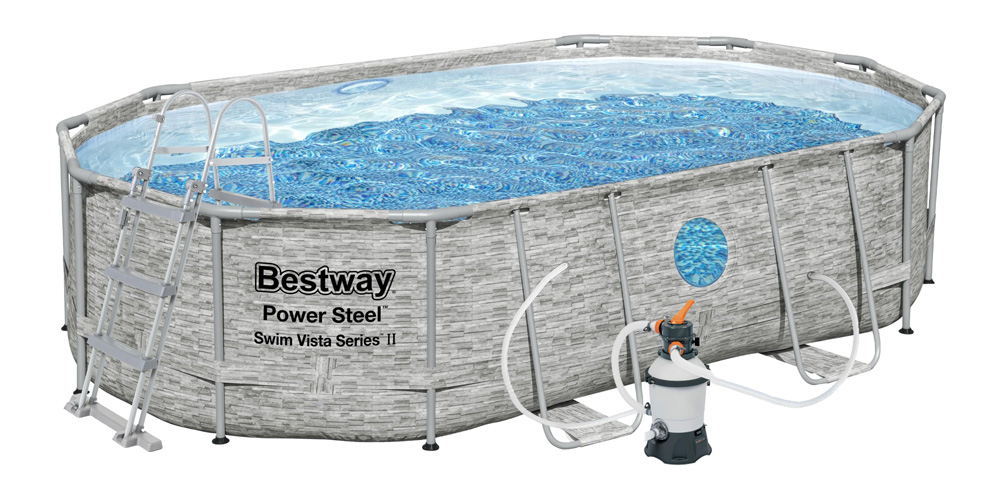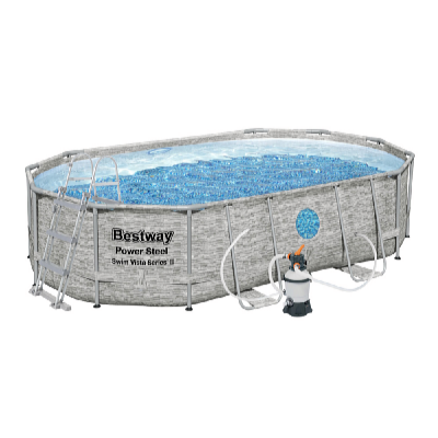 Oválny bazén Bestway Power Steel Stacked Stone 4,88 x 3,05 x 1,07 m. Kompletná súprava: bazén, piesková filtrácia, schodíky, krycia plachta.