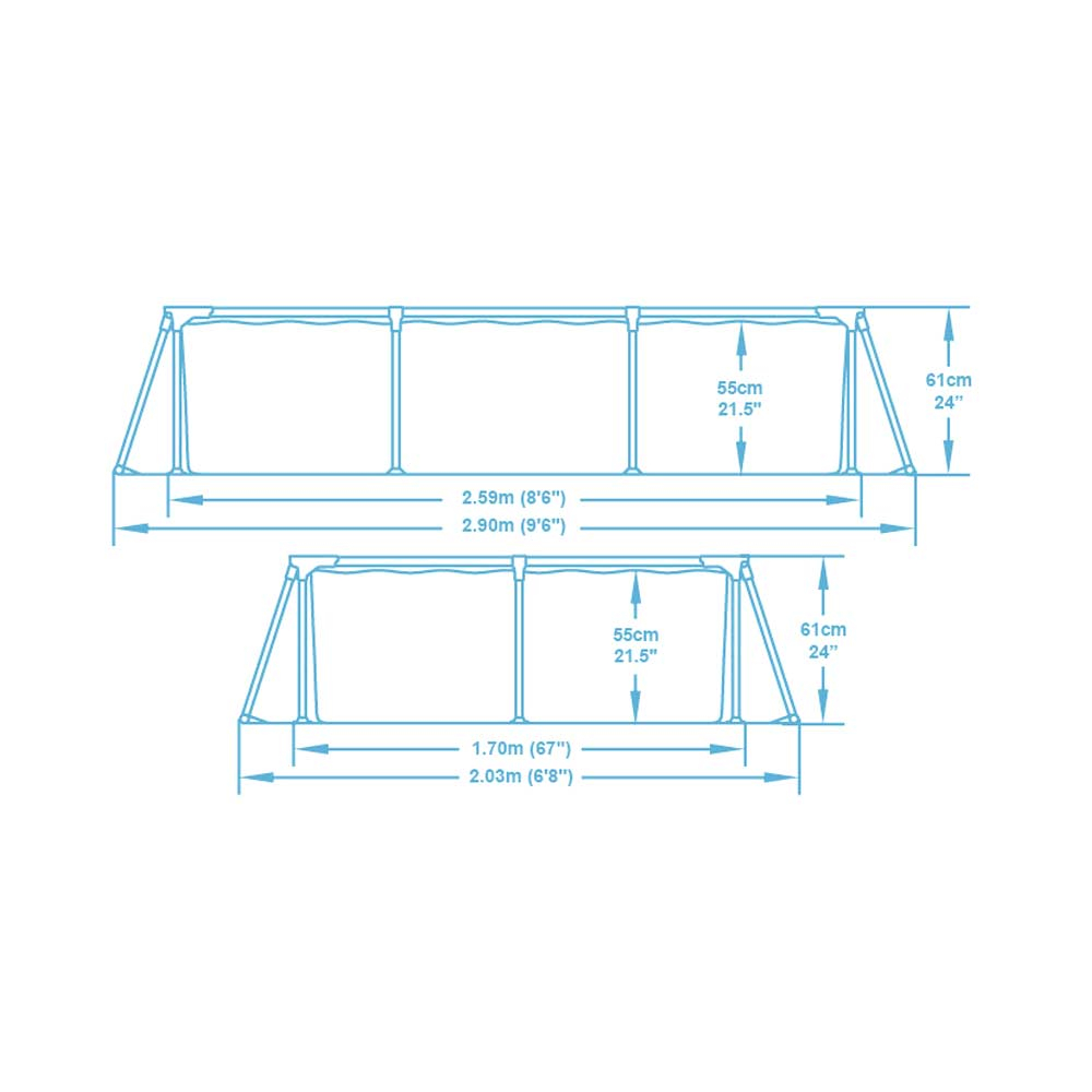 Obdĺžnikový bazén s kovovou konštrukciou. Nadzemný bazén s povrchovou montážou je vyrobený z trojvrstvového PVC, má pevné dno. Vďaka flexibilnej konštrukcii je bazén vhodný pre rodiny s deťmi.
