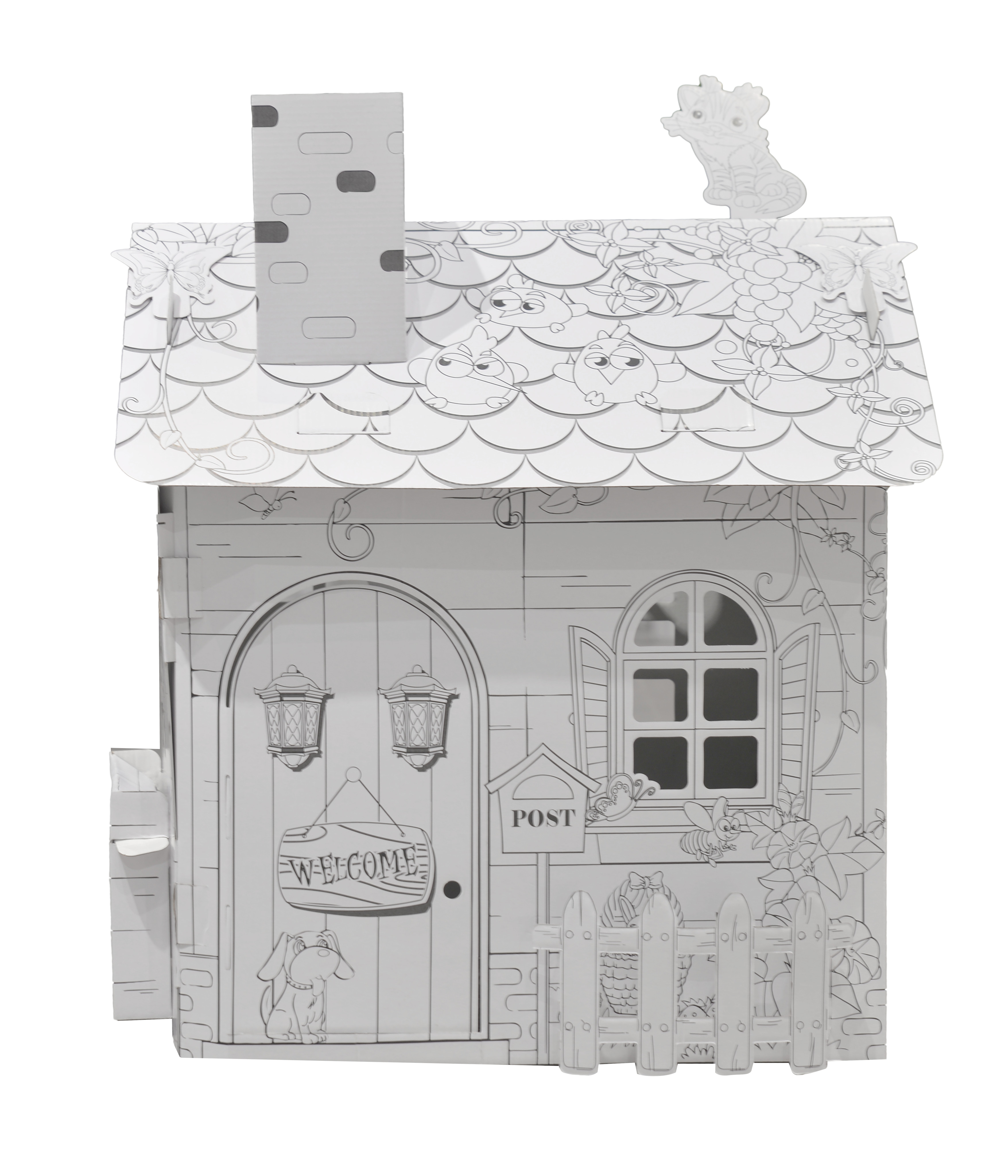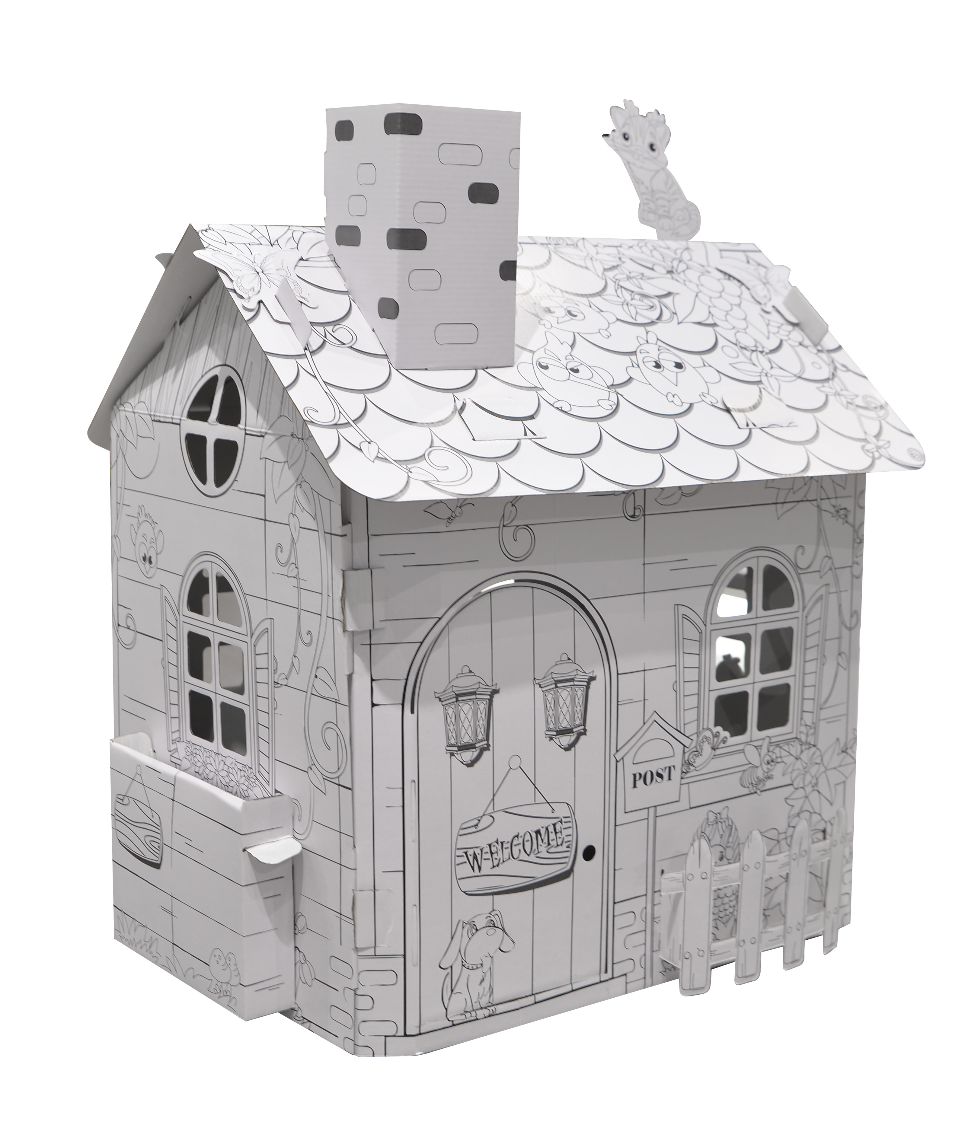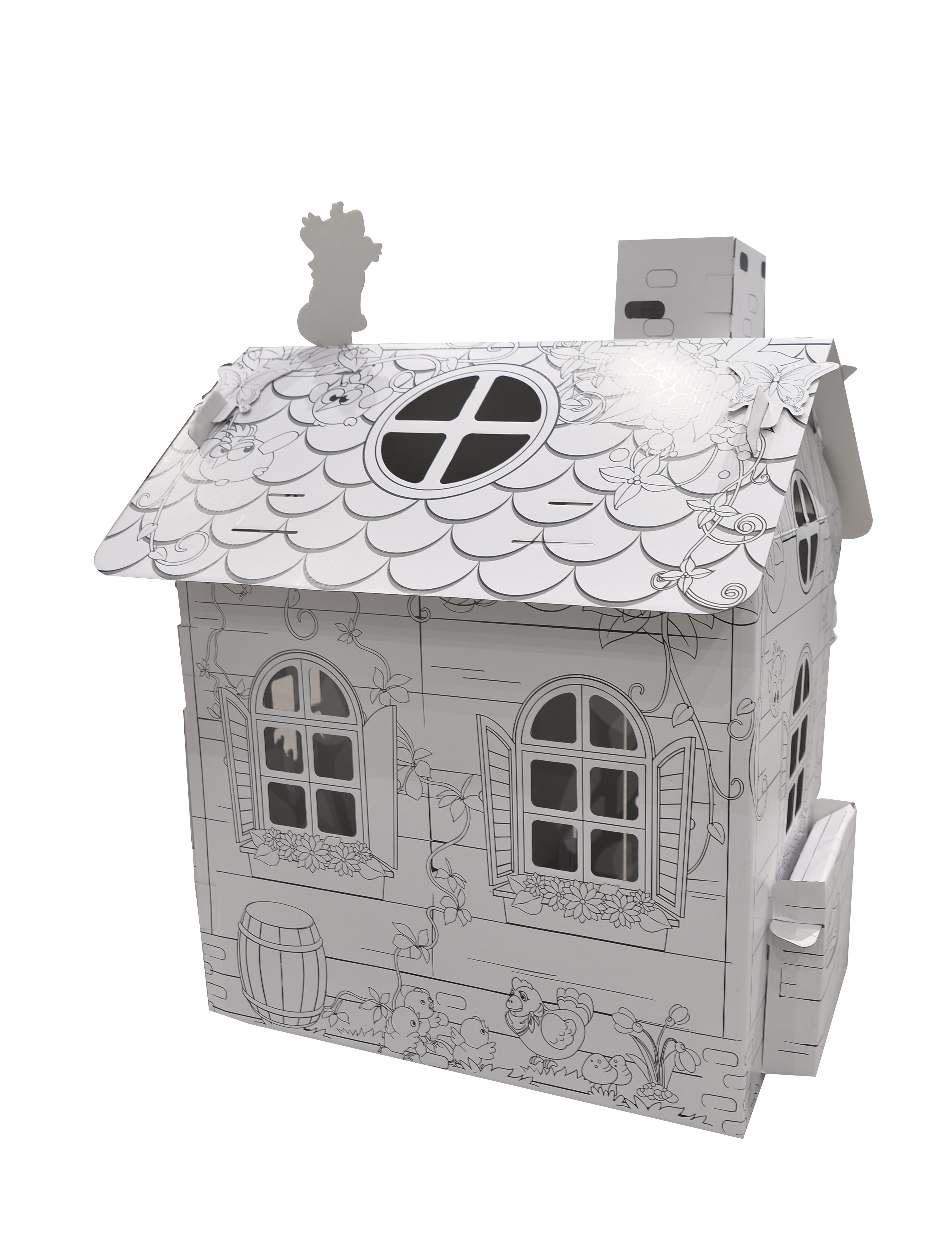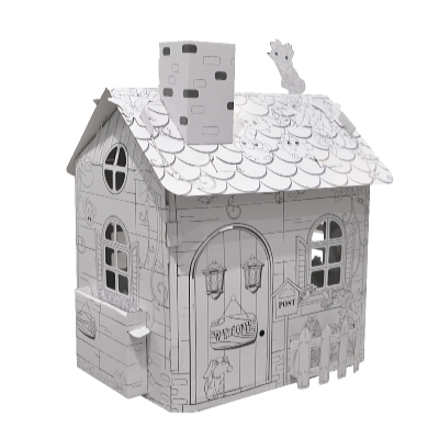 Kreatívna sada - kartónový domček s detskými motívmi je celý čiernobiely a jeho steny slúžia na maľovanie. Farebné prevedenie je úplne na detskej fantázii.