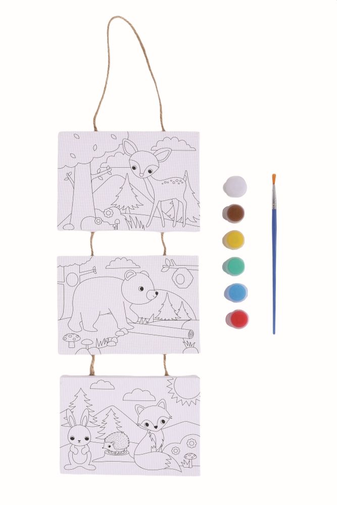 Súprava obsahuje: 3 maliarske závesné plátna s rozmerom 12,7 × 17,8 cm, 6 téglikov s farbou a 1 štetec.
