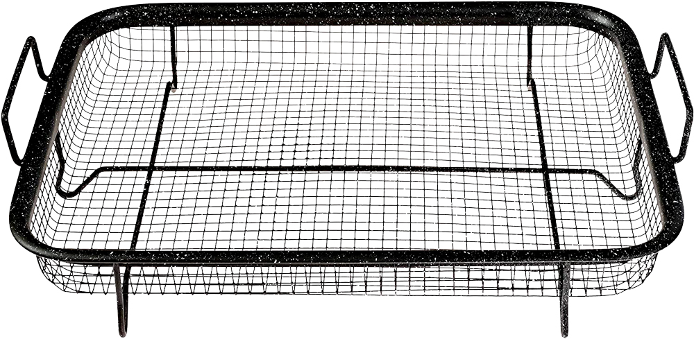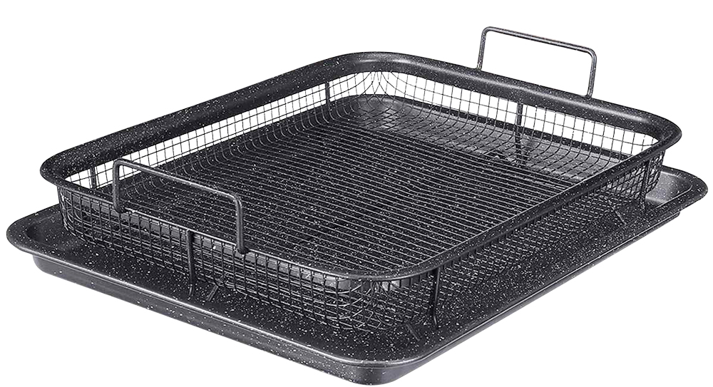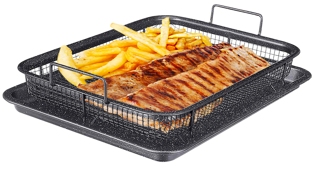 Plech s drôteným košom a nepriľnavým povrchom. Princíp teplovzdušnej rúry. Pripravíte si chrumkavé jedlo zo spáleného tuku.