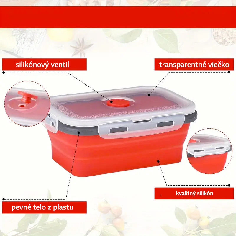 Praktické skladacie silikónové dózy pre ľahké balenie a uchovanie potravín. Ďalšie využitie silikónových dóz je napr. ako desiata do školy alebo do práce, na výlety a pod. Box má pevné postranné klipy a je skladací, prázdny zložený box tak zaberie pri skladovaní veľmi málo miesta. Dózy sú vhodné na použitie v chladničke, v mrazničke aj mikrovlnnej rúre.