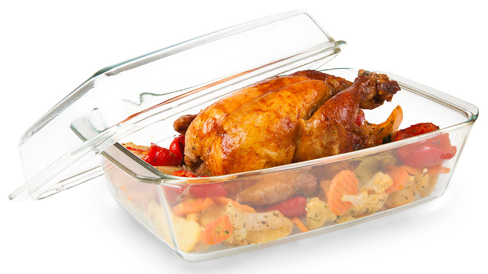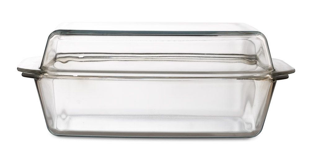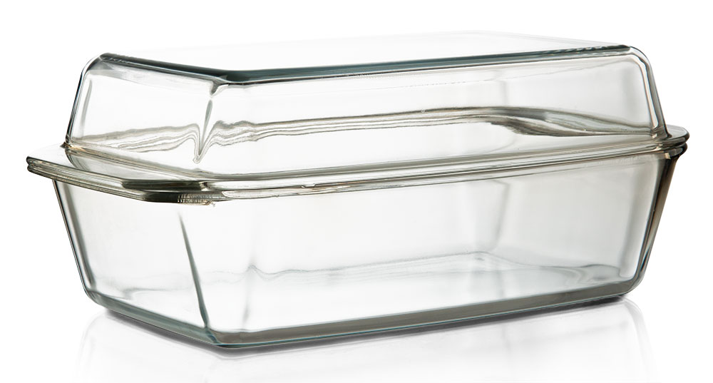 Hranatý sklenený pekáč z odolného skla vhodný na pečenie aj servírovanie pokrmov.