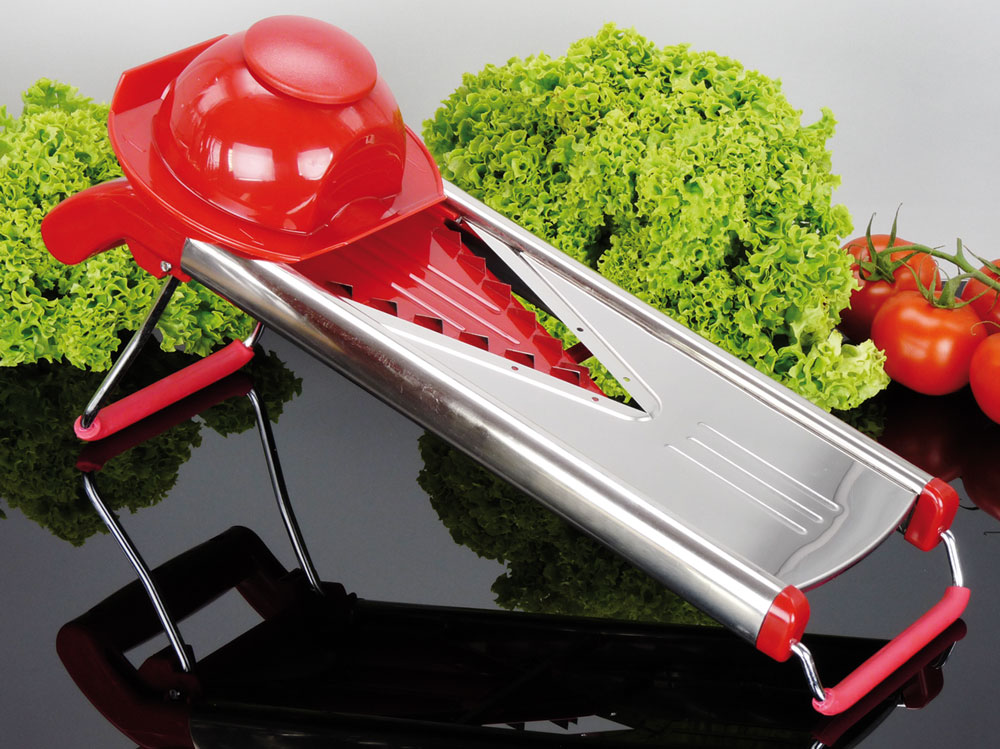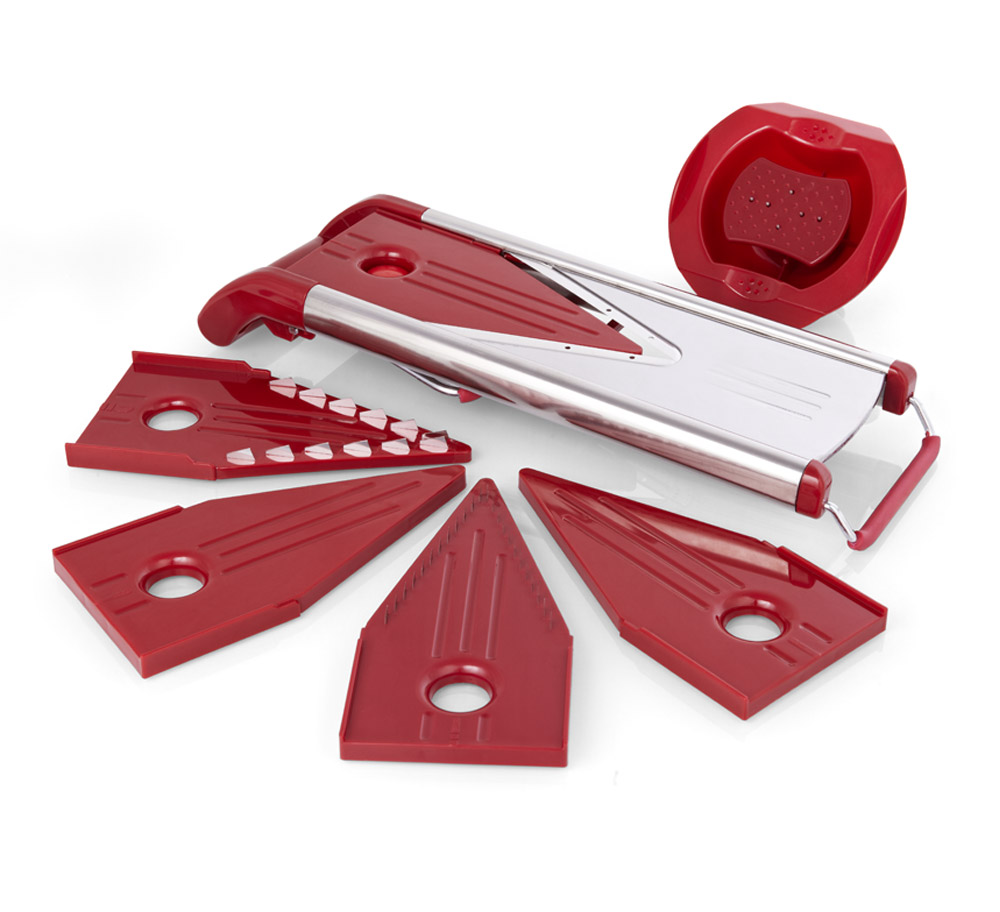 Vrátane: bezpečnostný držiak (ochranný kryt chráni vašu ruku po celý čas), vodiaca lišta, protišmykové podložky, stojan na uloženie nožov. V-krájač NEREZ sa veľmi ľahko čistí, stačí ho opláchnuť pod tečúcou vodou.