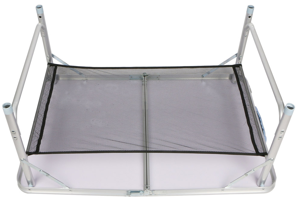 Kempingový stolík obdĺžníkového tvaru s praktickou sieťovanou poličkou, vhodný na cestovanie, terasu alebo záhradu.