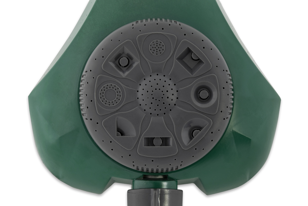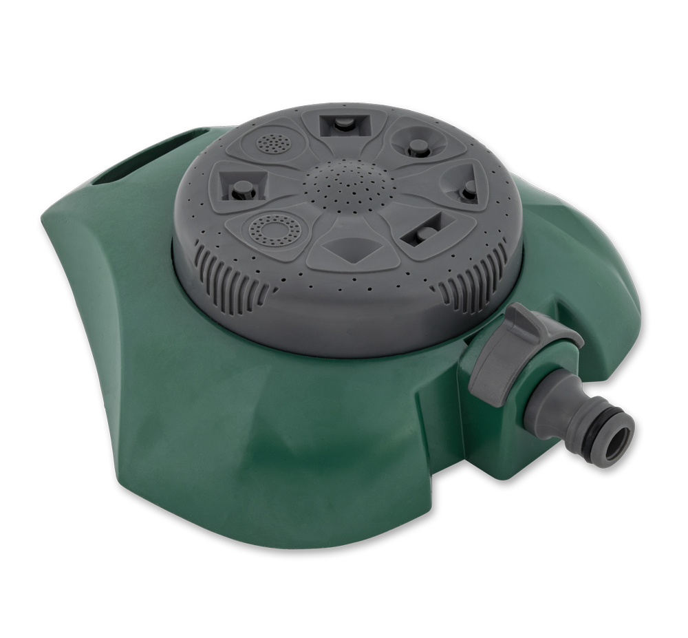 Zavlažovač s kovovou základňou, 8 režimov postreku, pripojenie hadice pomocou rýchlospojky.