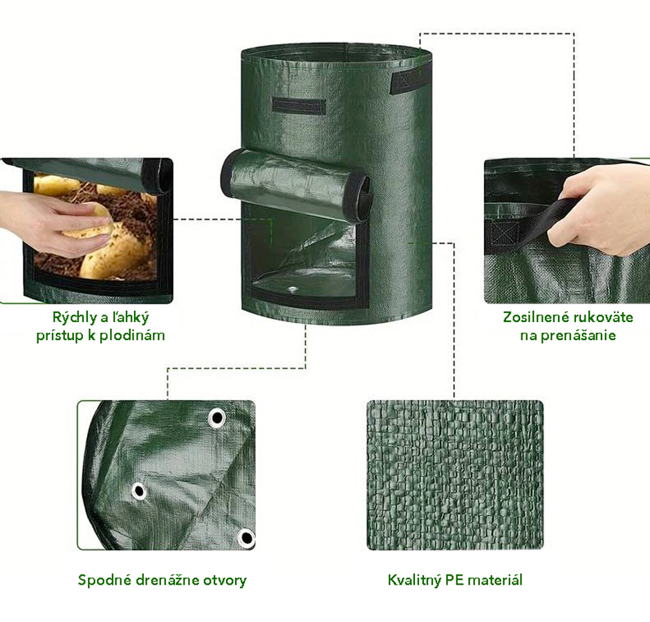 Pestovateľská taška VEGGIE je ideálna na domáce pestovanie všetkých druhov koreňovej zeleniny - zemiakov, paradajok, byliniek atď.