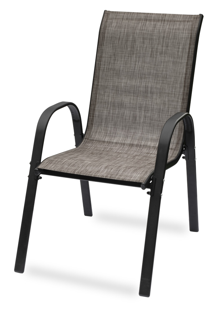 Stohovateľné kreslo s textilným čalúnením, vysoké operadlo.