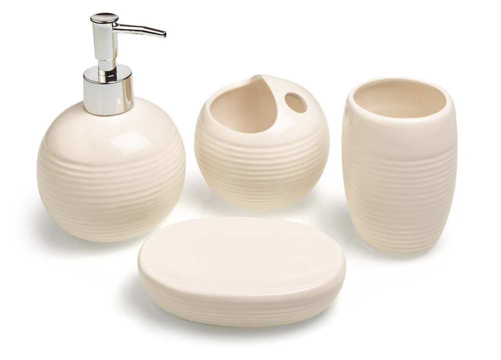 Kúpeľňová súprava z keramiky - elegantný a praktický doplnok vašej kúpeľne. Keramická kúpeľňová súprava má nadčasový dizajn - je vhodná do každej kúpeľne. Kúpeľňová súprava je vyrobená z bielej keramiky a je zdobená jemným vzorom - prúžkami.