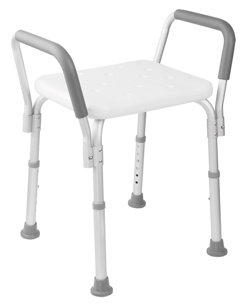 Kúpeľňová stolička s nastaviteľnou výškou uľahčuje používanie sprchy. Kúpeľňová stolička má hygienickú plochu na sedenie s protišmykovým povrchom, opierku chrbta a úchyty po stranách na jednoduché vstávanie.