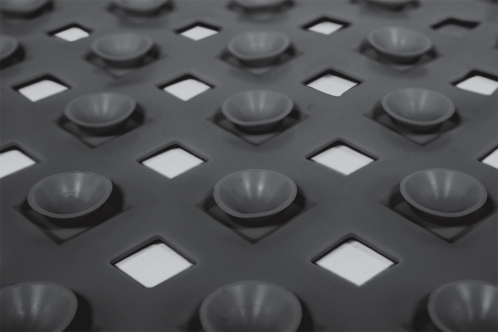 Podložka je na zadnej strane vybavená prísavkami na dokonalé uchopenie, vďaka ktorým podložka zostane na mieste, možno ju ľahko odstrániť a znova pripevniť. Otvory zabezpečujú plynulý odtok vody. Po použití stačí opláchnuť v teplej vode a nechať uschnúť.