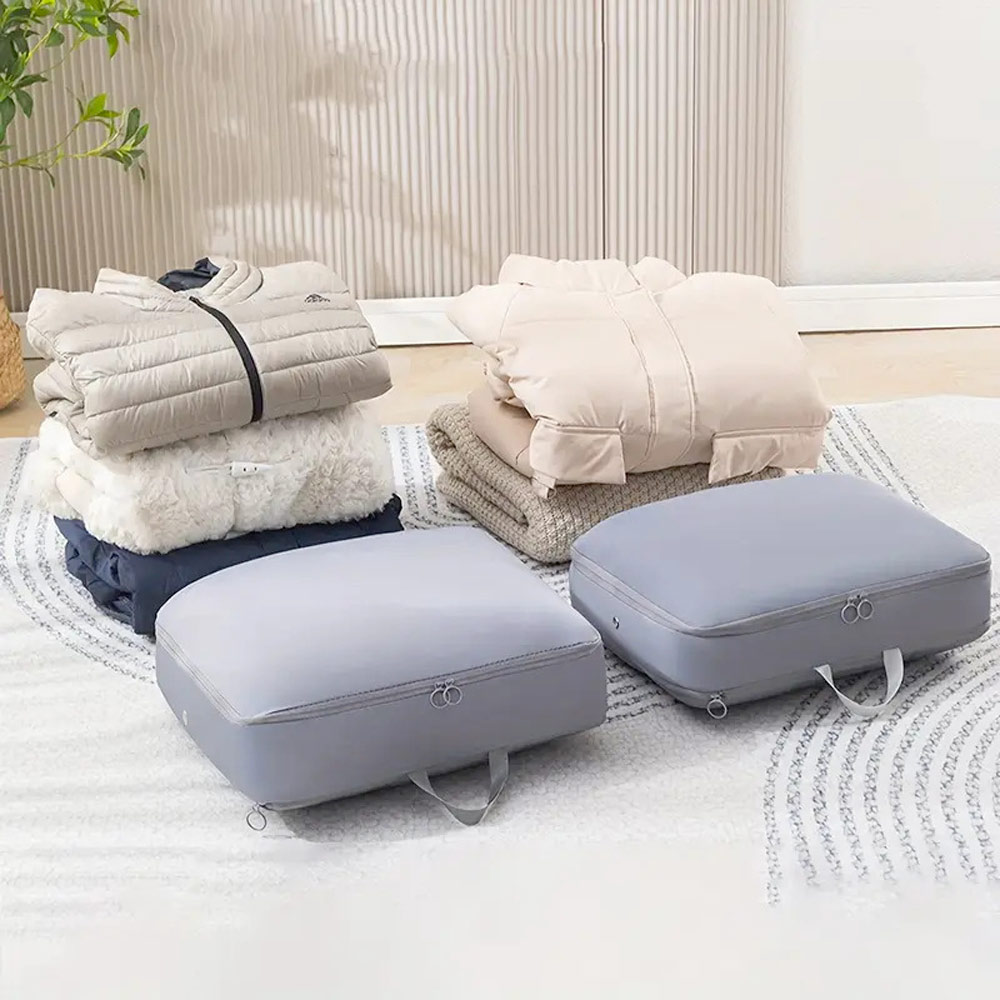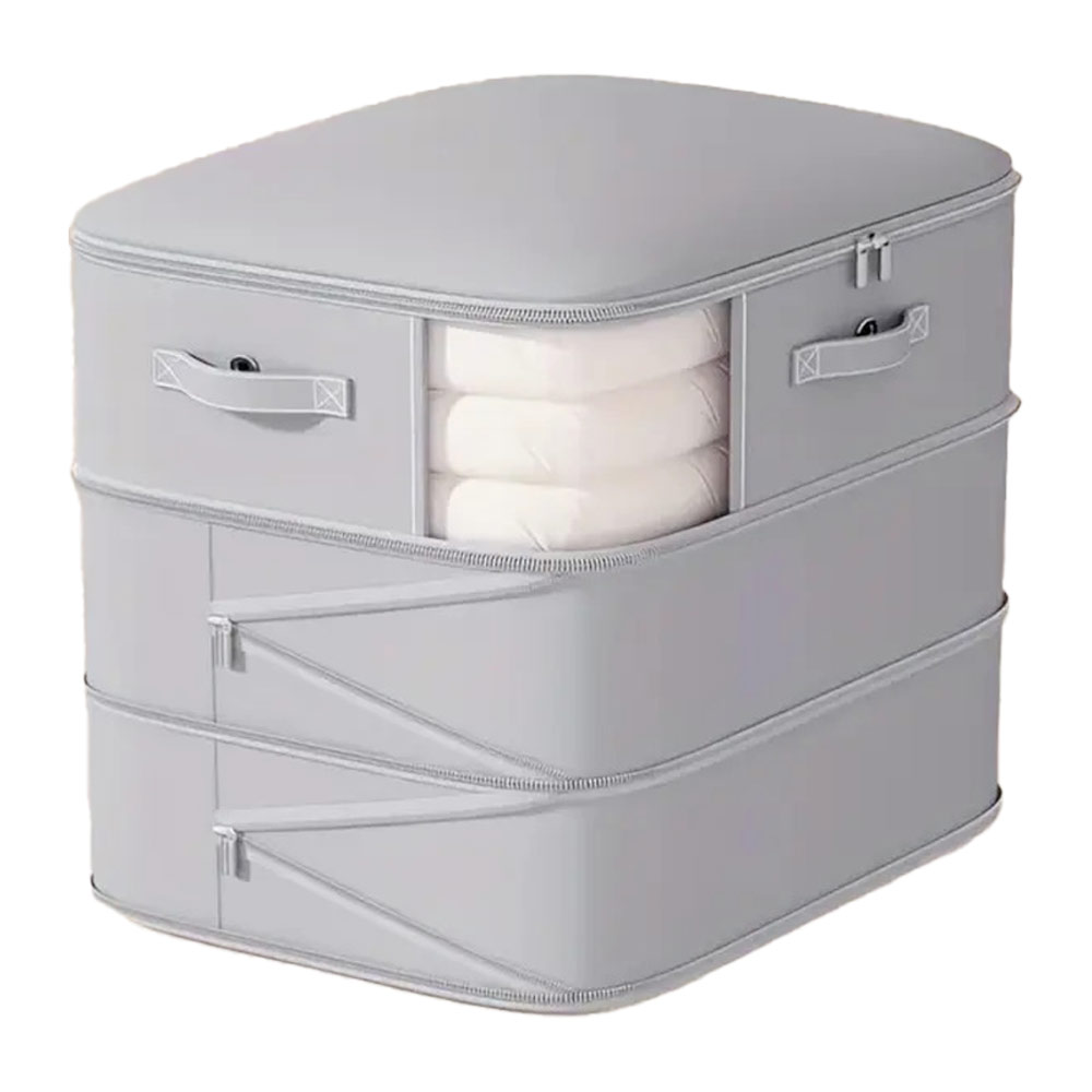 Skladací samokompresný organizér je ideálny na usporiadanie a skladovanie zimných prikrývok, diek, svetrov, prehozov, prestieradiel, detského oblečenia a ďalších sezónnych vecí. Hladká a mäkká tkanina chráni oblečenie pred záhybmi a škvrnami a zaisťuje vysokú funkčnosť a odolnosť počas cestovania. Vrchná časť na zips umožňuje ľahkú manipuláciu s predmetmi, ako je oblečenie a deky, takže je ideálna na sťahovanie, cestovanie a ubytovanie na koľajniciach.
