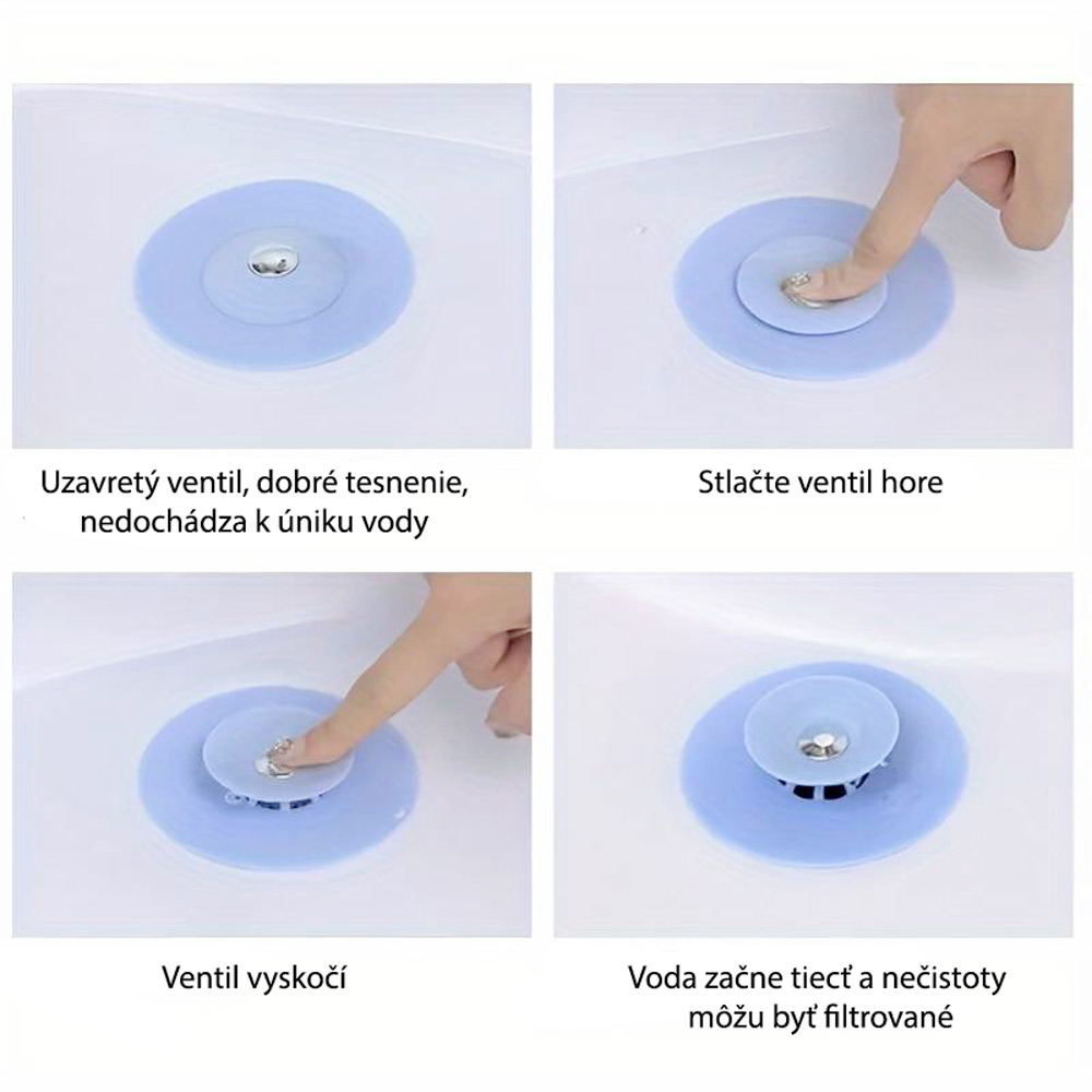 Jednoduché použitie - stačí stlačiť vrchnú časť v strede a zátka sa mierne zdvihne, aby umožnila odtok vody.