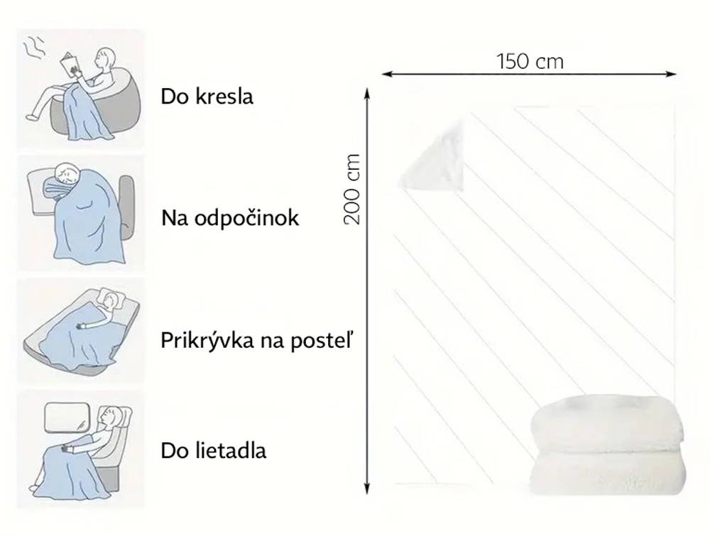 Teplá deka z veľmi mäkkého a príjemného materiálu. Dokonale zahreje počas chladných jesenných a zimných večerov. Deka je vhodná napríklad aj ako prehoz cez kreslo alebo pohovku, aby bolo sedenie pohodlnejšie.