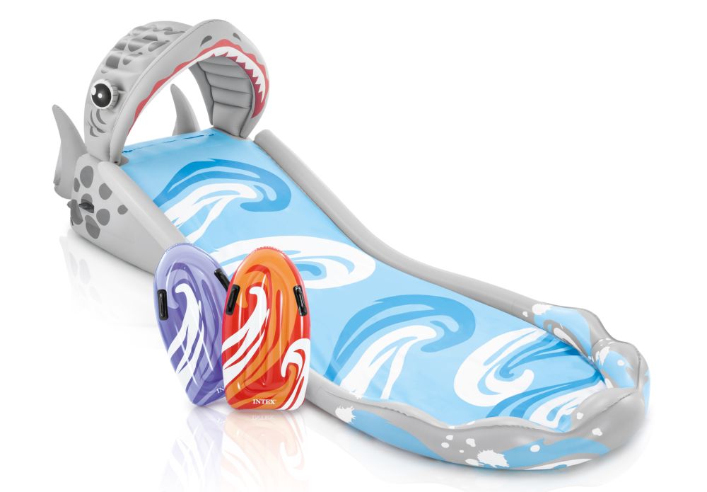 Vodná šmykľavka Surf&Slide sa ľahko zostavuje a nafukuje. Vodnú šmykľavku pripojte k záhradnej hadici, aby ste získali sprchu, ktorá zvlhčí povrch šmykľavky. Jej súčasťou je aj mäkká pristávacia plocha.