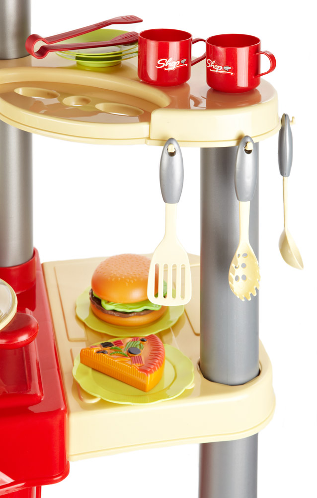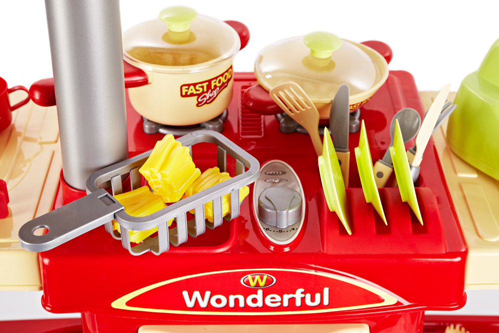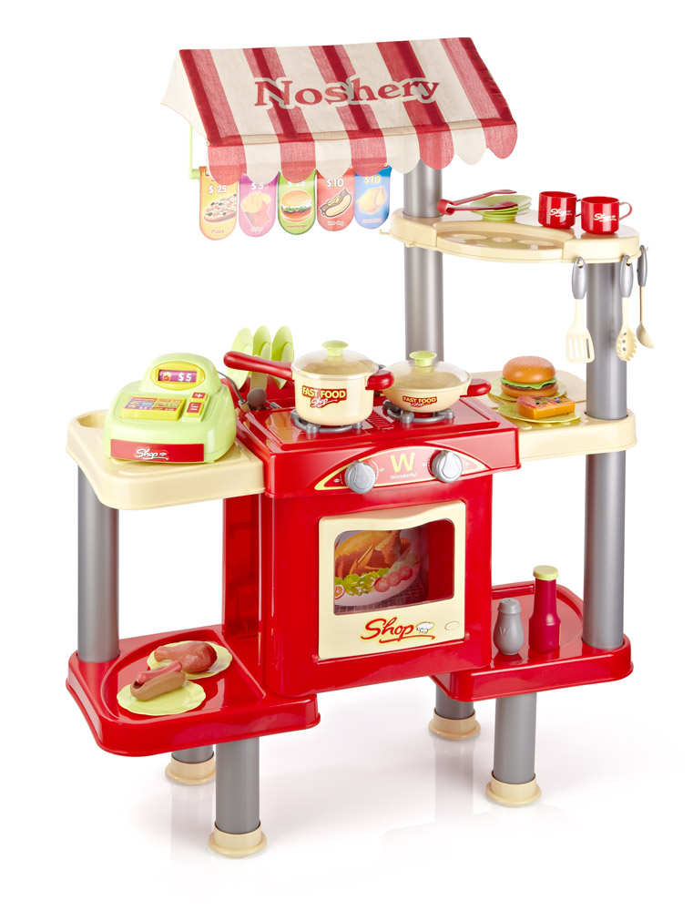 Rúra je vybavená dvoma horákmi, každý so samostatným vypínačom. Keď nastavíte horák, budete počuť charakteristické "škrabanie". Súprava obsahuje aj samostatné miesto na vyprážanie hranolčekov s vlastným gombíkom. Dvojúrovňová umývačka riadu umýva všetok riad. Ceny svojich výrobkov môžete zavesiť na látkovú striešku kulinárskych stojanov. Pokladňa s peniazmi automaticky vyberie predávaný výrobok. Množstvo košov na odkladanie pripravených hotových jedál.