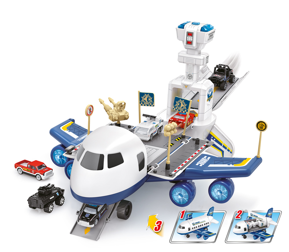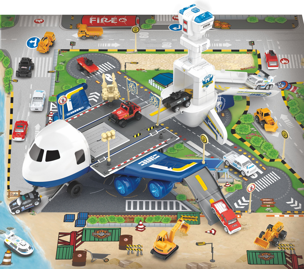 Multifunkčný model transportného lietadla. Vrátane príslušenstva - autíčka, značky, hracia podložka.