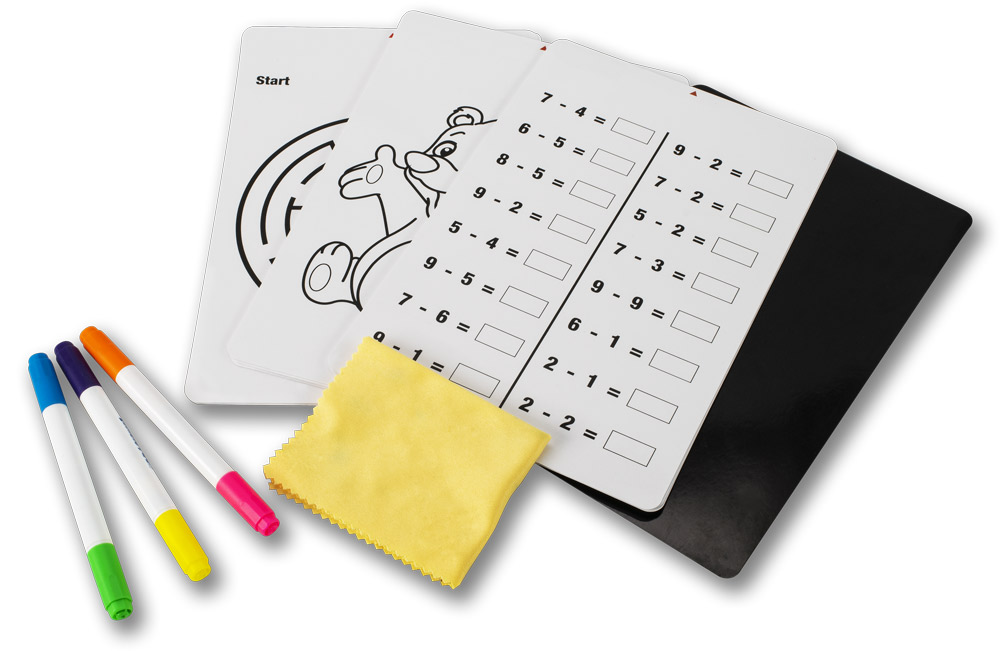 osvetlená tabuľa, 3 obojstranné neónové fixky, 1 čierna karta, 15 obojstranných kariet, čistiaca handrička