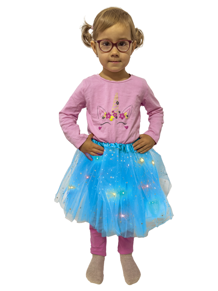 Vrstvená baletná tutu sukňa LED so svetlami vytvára pri pohybe čarovné svetelné efekty ako v rozprávke! Svetelná sukňa LED je vyrobená z kvalitného polyesterového materiálu a je mäkká a pohodlná. Žiarivé farby v kombinácii so svetelnými šnúrkami LED vytvárajú pri pohybe dieťaťa priam magický efekt. V páse sa nachádza malá plastová krabička s vypínačom a miestom na vloženie batérií. Svietiaca sukňa s LED diódami má elastický pás, a preto rastie spolu s dieťaťom, môže sa používať dlhý čas.