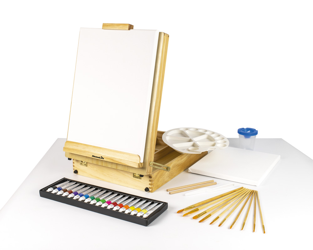 Veľká sada v praktickom kufríku z borovicového dreva pre začiatočníkov aj pokročilých maliarov. Stolový maliarsky stojan v kufríku má výškovo nastaviteľný držiak maliarskeho plátna, max. výška obrazu je 70 cm, nastaviteľný uhol sklonu.