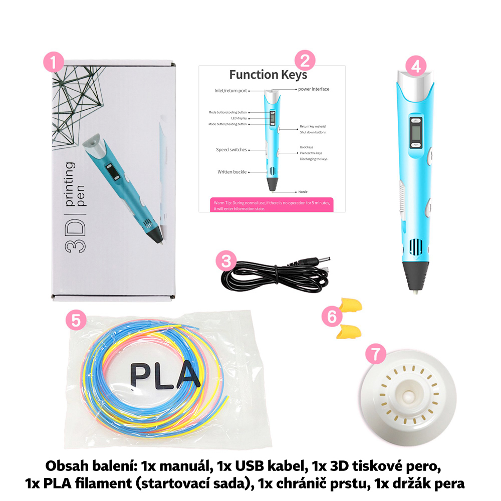 - obsah balenia - 3D pero s LCD displejom, USB kábel, štartovacia sada PLA filamentov, 2x chránič prsta a praktický držiak pera