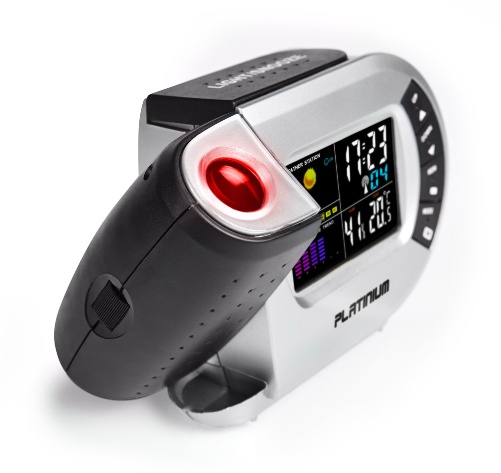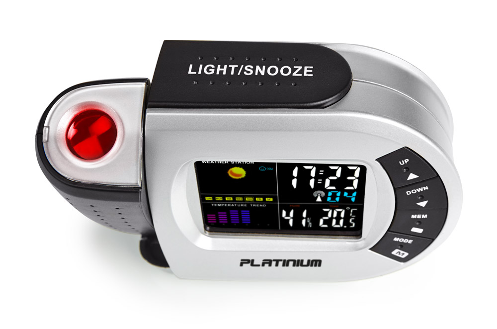 Budík s integrovanou meteorologickou stanicou. Budík má možnosť premietania času na perinu alebo na akúkoľvek stenu či iný povrch v spálni.