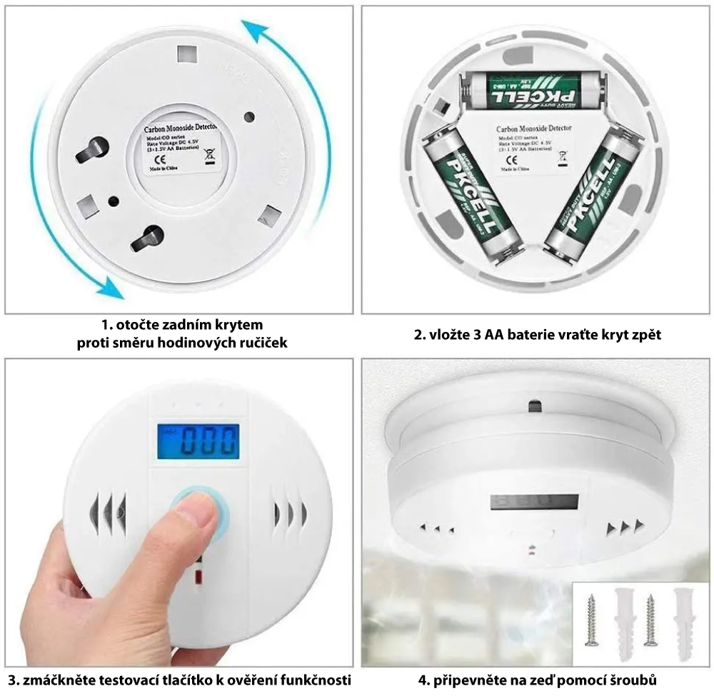 - obsah balenia - detektor oxidu uhoľnatého s ukazovateľom PPM, montážna sada (skrutky)