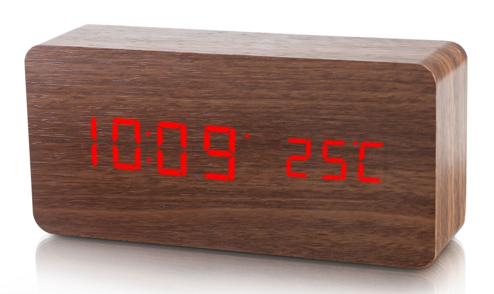 Budík s teplomerom v jedinečnom drevenom dizajne pre tých, ktorí uprednostňujú klasický budík pred mobilným telefónom. Drevený digitálny budík je zároveň štýlovým doplnkom nočného stolíka alebo poličky. Digitálny displej budíka je červený.