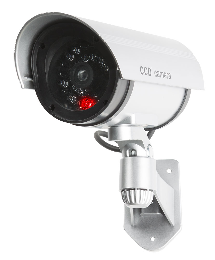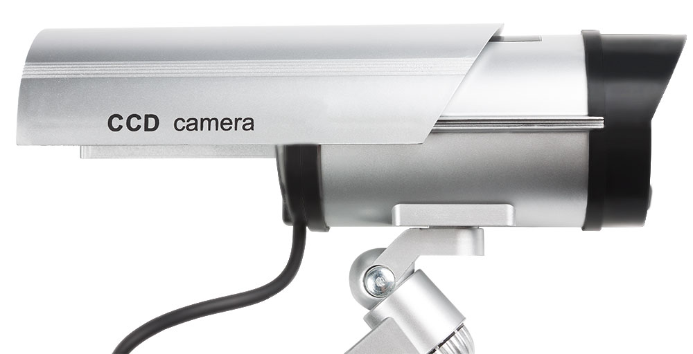 Atrapa vonkajšej bezpečnostnej kamery s blikajúcou LED diódou.