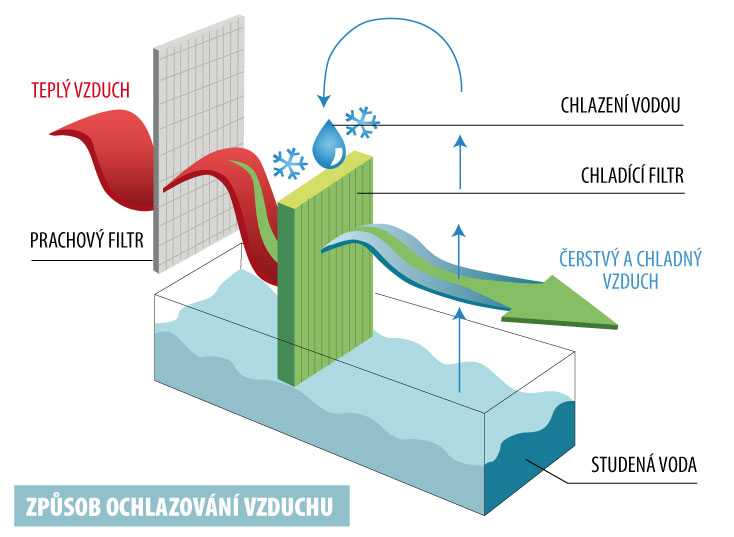 Mobilní ochlazovač vzduchu zajistí příjemné klima v místnosti i v letních tropických dnech, zajistí dýchlatelnost vzduchu a ochladí jej. Vyfukovaný vzduch je zvlhčen, ochlazen studenou vodou a ionizován. Mobilní ochlazovač vzduchu je vhodný pro prostory, kde není možné nebo vhodné provést montáž klasické klimatizace.