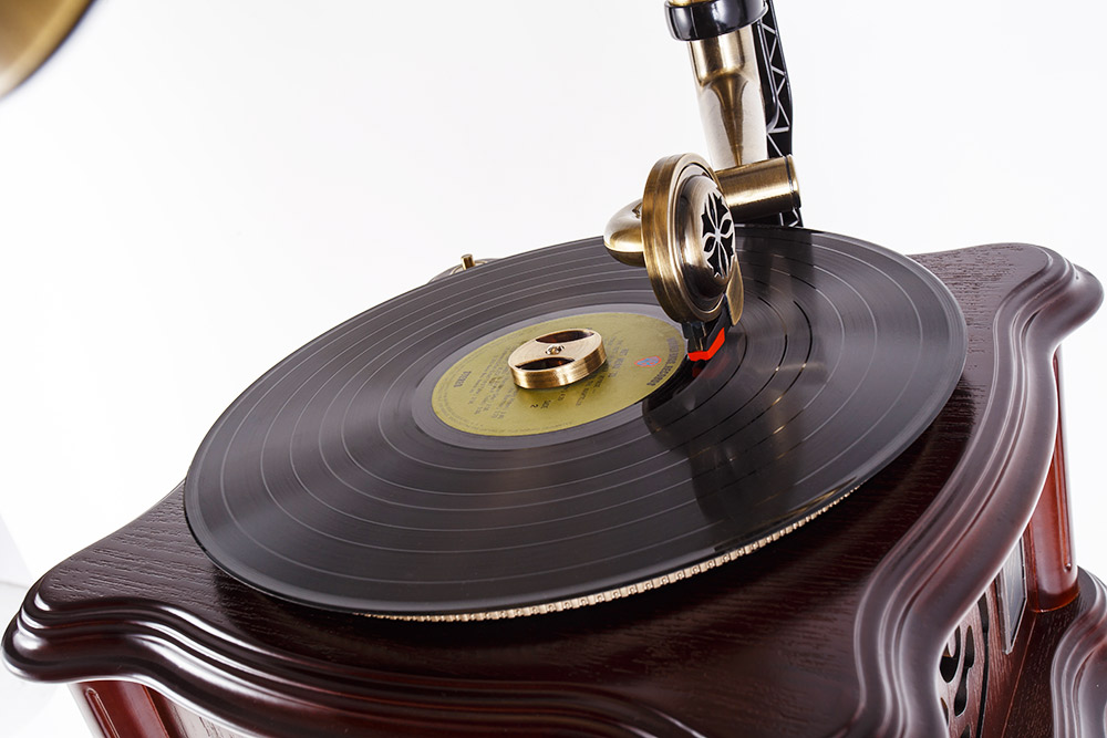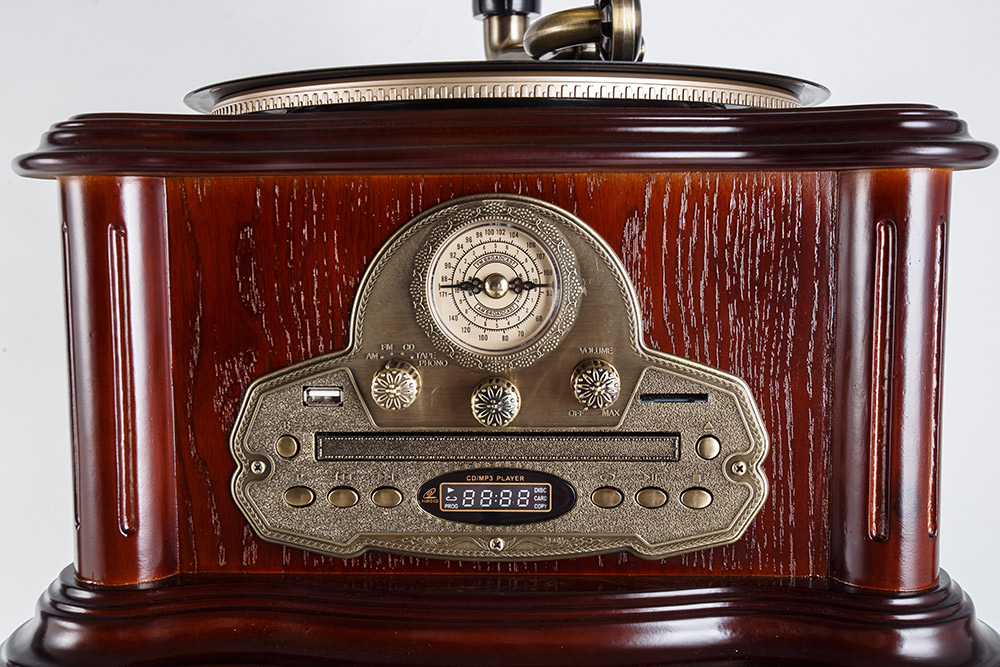 Viacrýchlostný gramofón, diaľkové ovládanie, CD/MP3 prehrávač, rádio.