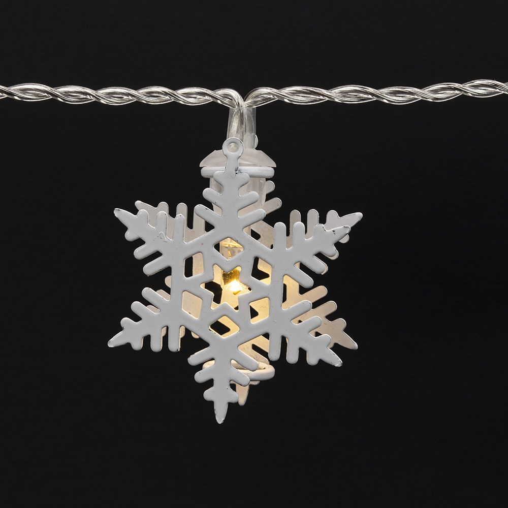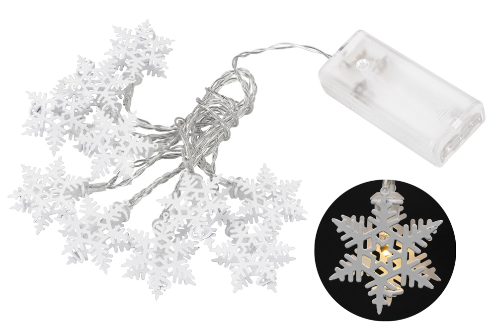 Interiérová svetelná reťaz LED, motív snehovej vločky, teplá biela farba, napájanie batériami.