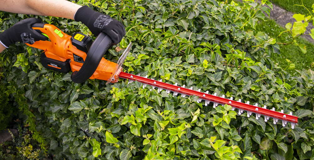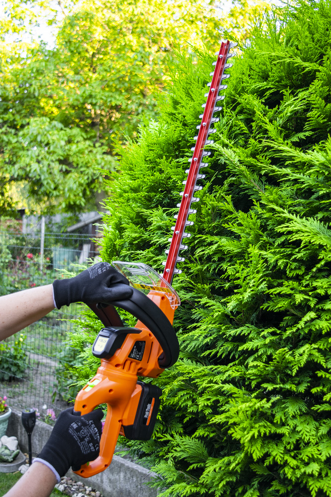 Akumulátorové plotové nožnice na strihanie živých plotov alebo okrasných drevín v záhradách. Jednoduché, praktické a bezpečné použitie bez otravných káblov.