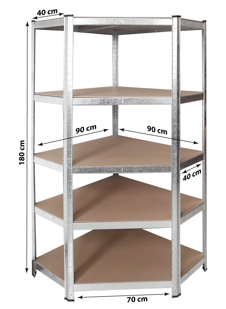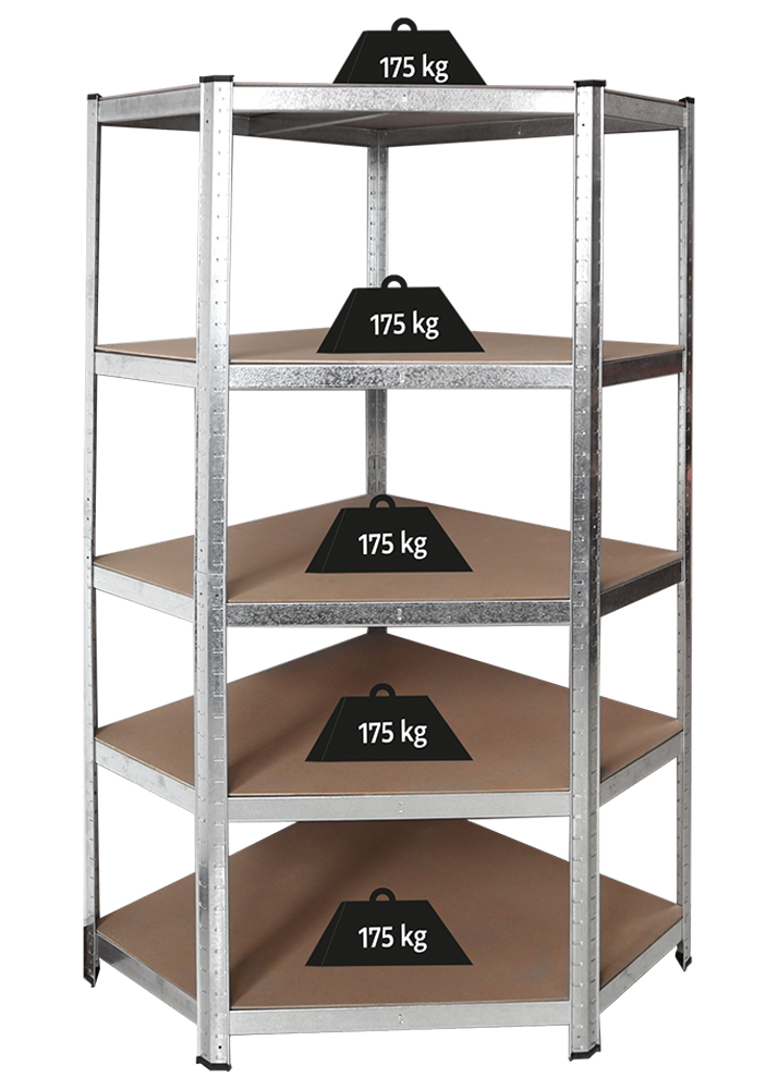 Rohový kovový regál s policami z MDF, nosnosť políc 175 kg. Jednoduchá montáž bez použitia náradia.