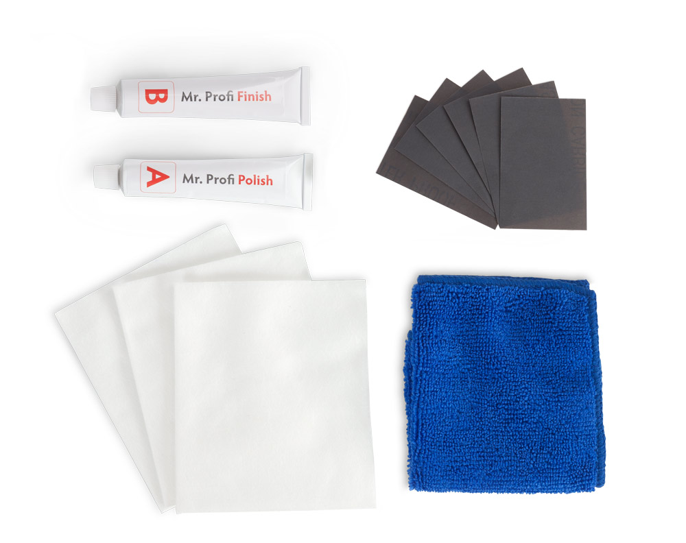 Pomocou súpravy Mr.Profi Paint Repair Kit môžete rýchlo a trvalo odstrániť škrabance a stopy po laku zo všetkých lakovaných povrchov vášho vozidla. V mnohých prípadoch vám súprava Mr. profi môže ušetriť peniaze za opravu laku v lakovni. Súprava na opravu laku Mr. profi je vhodná na klasické laky, ako aj na kovové laky. Mr Profi rýchlo a spoľahlivo odstraňuje škrabance, drobné preliačiny a stopy po laku z laku. Možno ju použiť na automobily, motocykle, karavany, lode atď. Dva rôzne špeciálne leštiace prípravky dokážu odstrániť plytké aj hlbšie škrabance. Podmienkou však je, že ryha nesmie zasahovať do základného náteru.