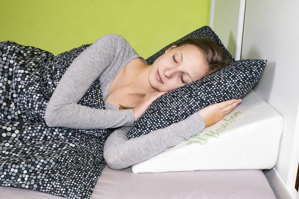 Klinový podhlavník z pamäťovej peny a bambusového poťahu, vhodný ako vyvýšenina pod vankúš alebo matrac, udržiava hornú polovicu tela vo zvýšenej polohe.