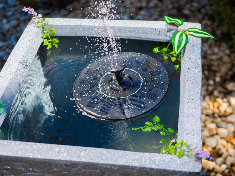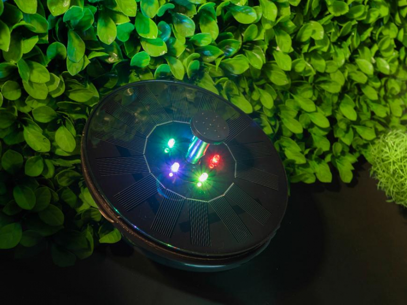 Plávajúca solárna fontána je napájaná solárnym panelom.