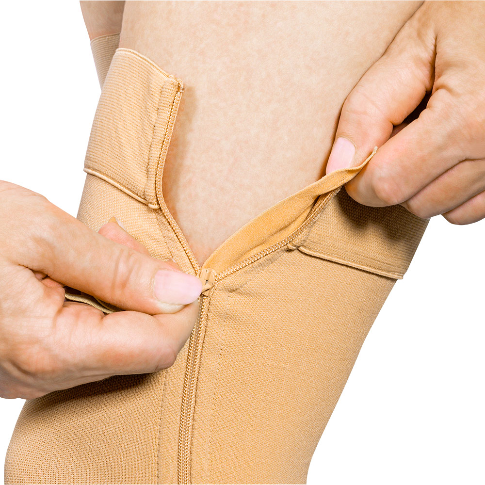 Obliekanie kompresívnych ponožiek, pančúch alebo pančuchových nohavíc je zvyčajne veľmi namáhavé, ťažko sa obliekajú na nohy. Stehenné kompresívne pančuchy majú praktický zips, takže sa dajú ľahko obliecť a vyzliecť. Stehenné kompresívne pančuchy upokojujú a oživujú nohy, pomáhajú zbaviť sa nepríjemnej bolesti nôh a opuchov.